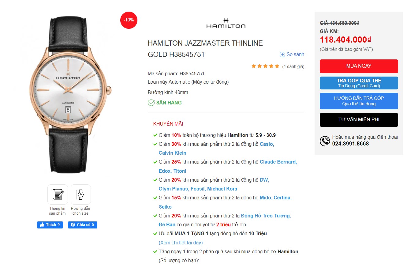 - Đối với đồng hồ hamilton vỏ vàng 18K: Giá sẽ hơn 110tr