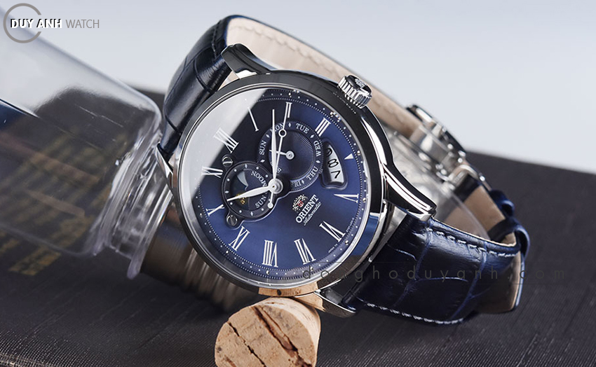Theo quan điểm của tôi, Orient không nhất thiết đưa logo vào chiếc đồng hồ này, bởi nó vô tình đã phá vỡ sự kết hợp hoàn hảo những chi tiết màu trắng trên nền bầu trời đêm xanh thẳm. Khép lại phần mặt số là bộ 3 kim truyền thống với kiểu feullie, được phủ màu trắng, đồng màu với các vạch số la mã cổ điển. Mặt đồng hồ cỡ 42.5mm nhưng với thiết kế viền hợp lý, chiếc đồng hồ nam có thể được đeo vừa vặn và thoải mái bởi những người có cổ tay trung bình.