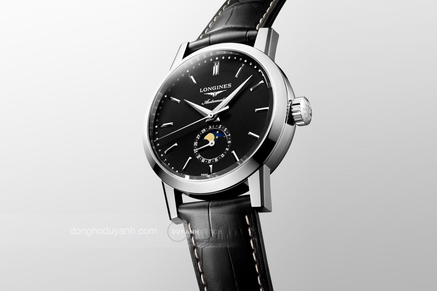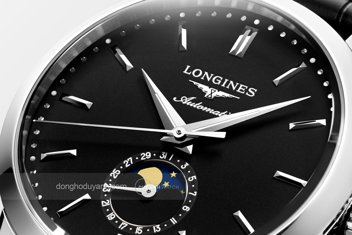 Mặt số màu đen bóng mang đến chiều sâu thị giác ấn tượng. Các cọc số dạng thanh mảnh cùng bộ kim dauphine sáng bóng được bố trí cân đối, giúp tổng thể trở nên rõ ràng và dễ đọc. Logo Longines và dòng chữ Automatic được đặt trang trọng phía trên, khẳng định tinh thần truyền thống của bộ sưu tập.
