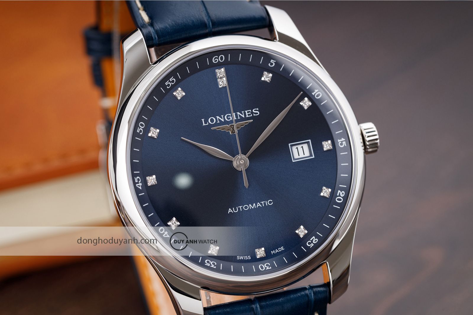 Mặt số xanh sunray đính kim cương: Điểm nhấn nổi bật nhất của Longines Master L2.893.4.97.0 chính là mặt số xanh lam sunray. Dưới ánh sáng, mặt số tạo hiệu ứng chuyển sắc mềm mại, mang lại chiều sâu thị giác và cảm giác sang trọng rất đặc trưng của đồng hồ cao cấp Thụy Sĩ.