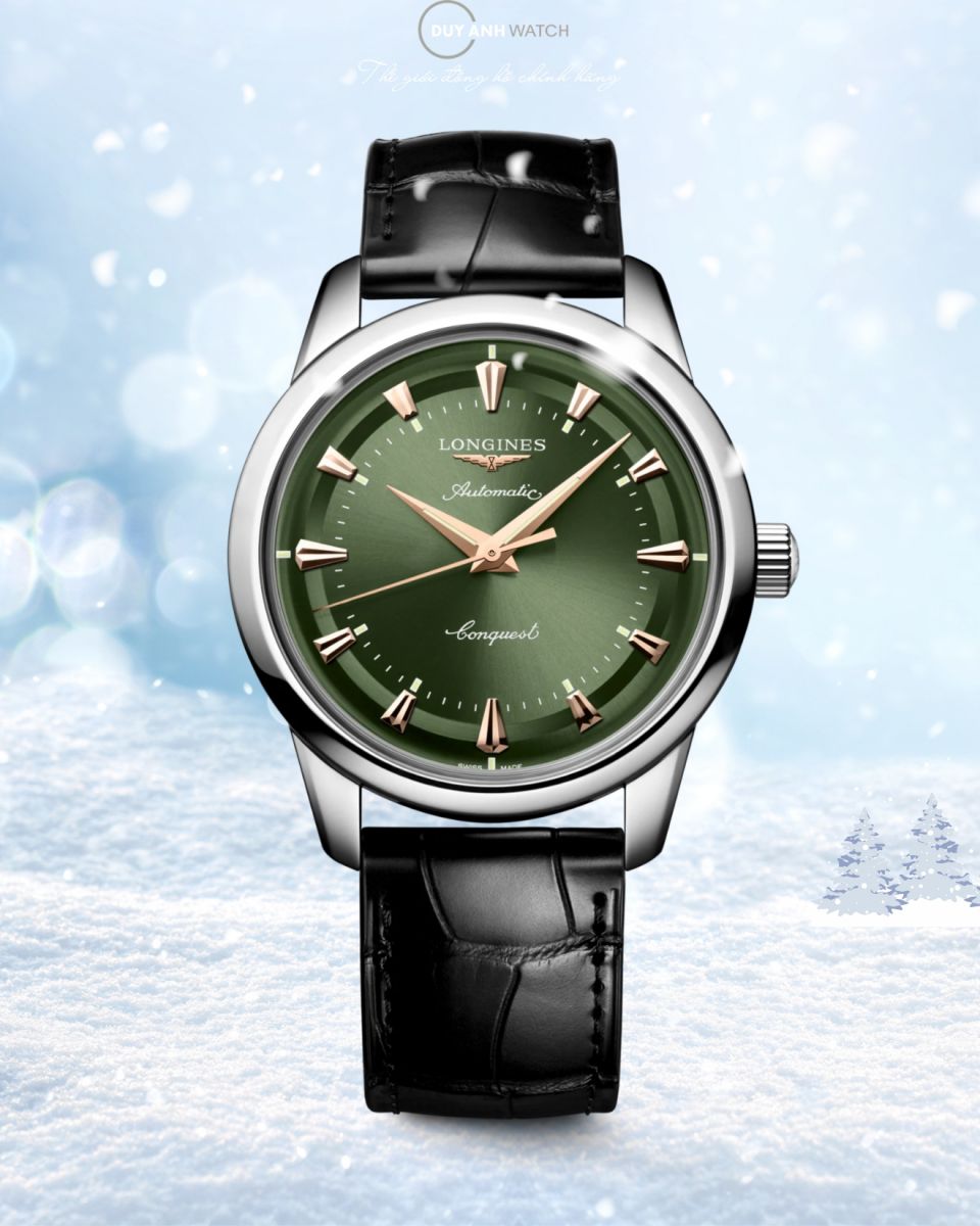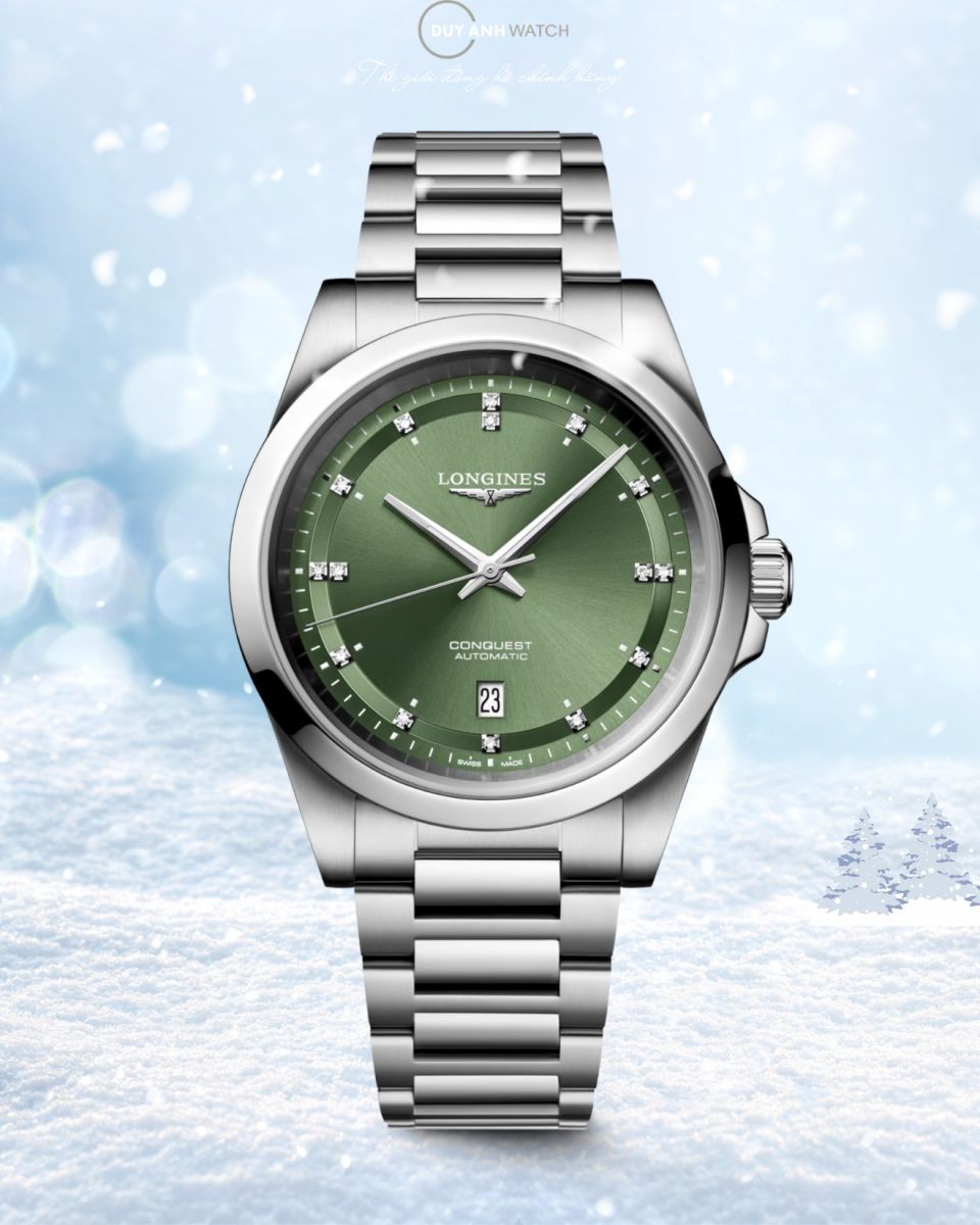 Longines Conquest L3.830.4.07.6 là lựa chọn hoàn hảo cho mùa đông 2025. Mặt số sunray xanh lục ấm áp kết hợp vỏ thép 41 mm và dây thép chắc chắn, tạo vẻ thể thao nhưng vẫn lịch lãm. Bộ máy tự động L888 với lò xo silicon trữ năng lượng 72 giờ, kính sapphire chống trầy và khả năng chống nước 100 m đảm bảo độ bền và tiện dụng. Đây là chiếc đồng hồ nổi bật, vừa sang trọng, vừa phù hợp với phong cách mùa lạnh.