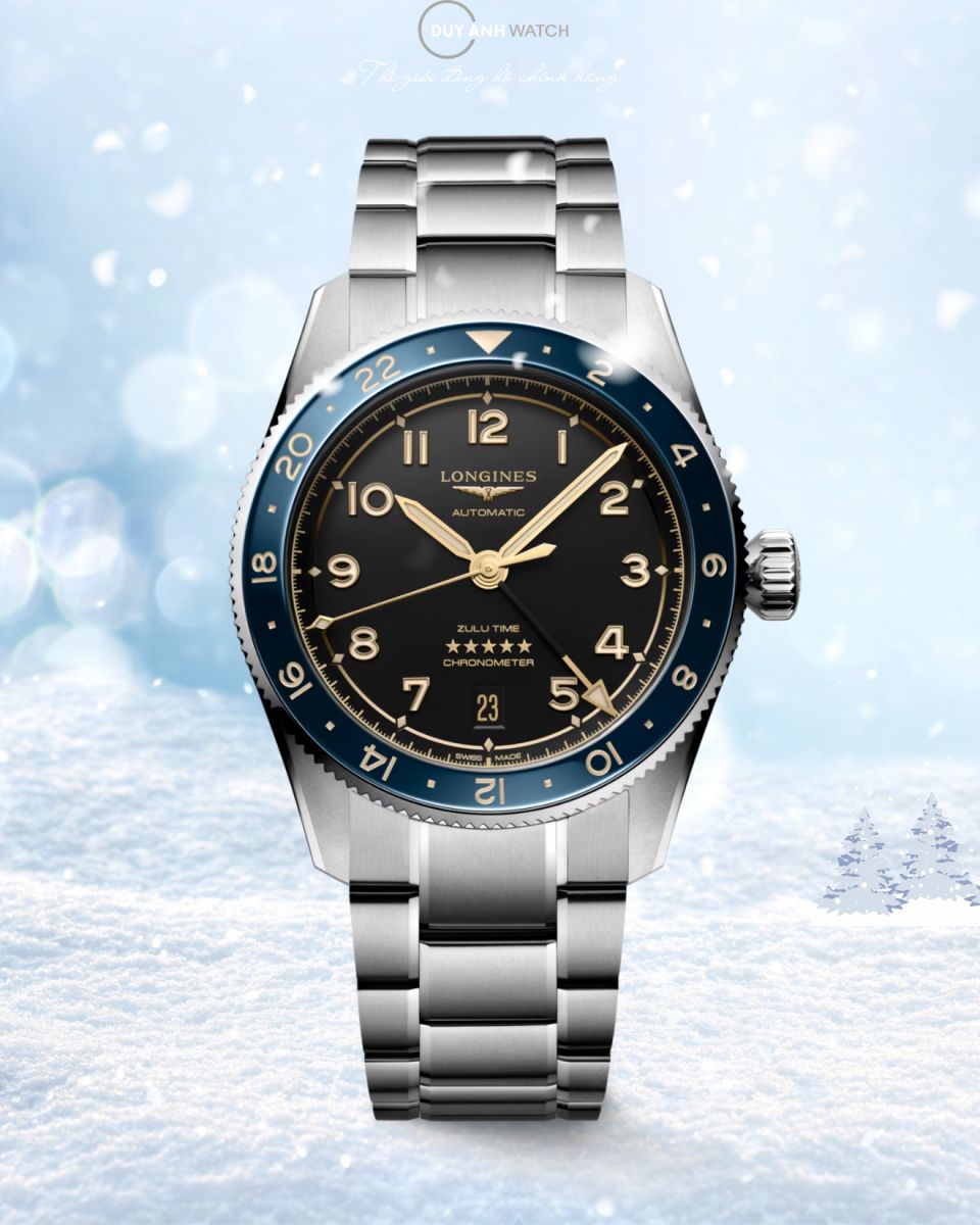 Một lựa chọn rất đáng cân nhắc cho mùa đông 2025 là Longines Spirit Zulu Time L3.802.4.60.6. Chiếc này có vỏ thép 39 mm kết hợp với vành bezel ceramic xoay hai chiều, mang lại vẻ thể thao nhưng tinh tế. Bộ máy automatic L844.4 được chứng nhận COSC, sử dụng lò xo silicon, trữ cót tới 72 giờ.