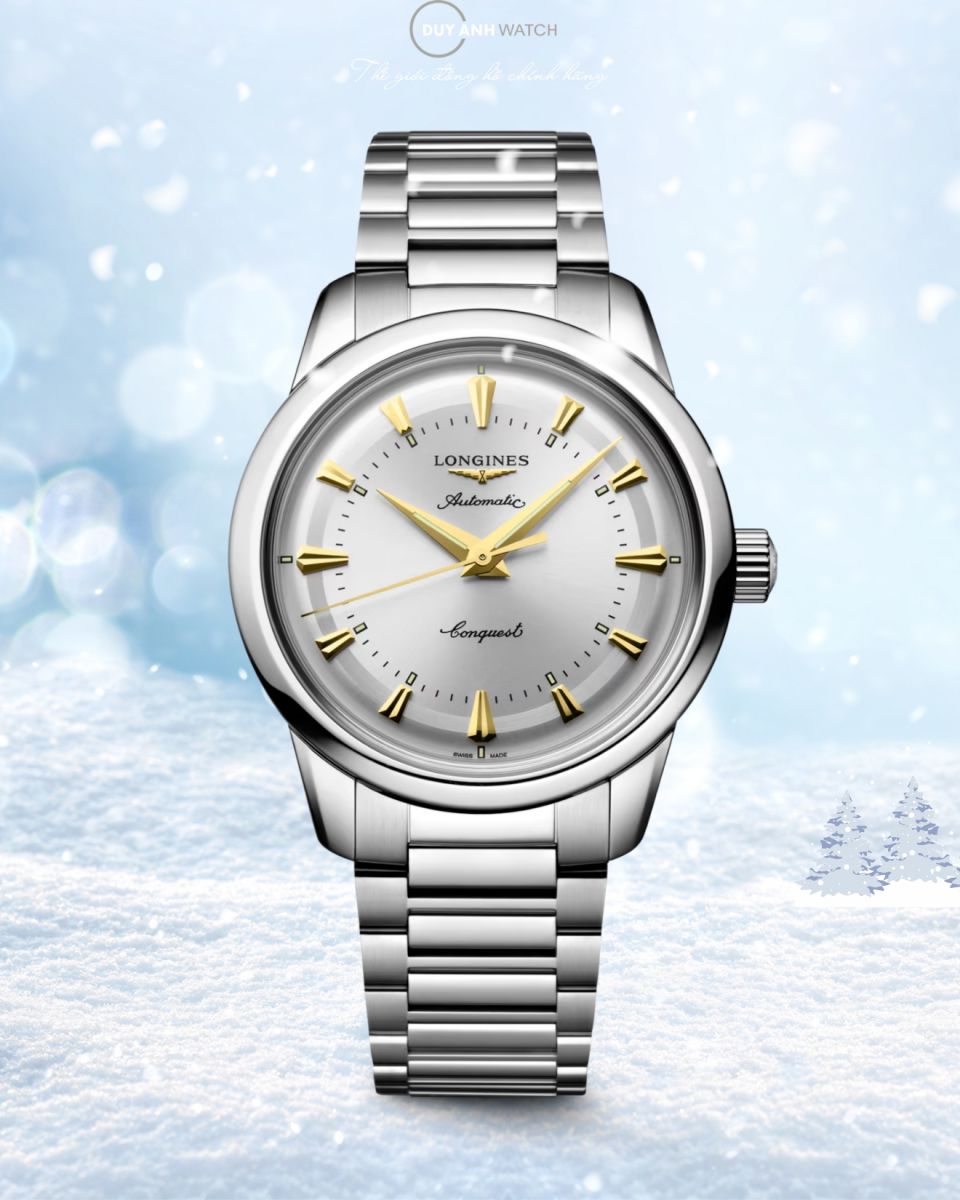 Chiếc đồng hồ này mang thiết kế hoài cổ lấy cảm hứng từ Conquest thập niên 1950, nhưng được ứng dụng công nghệ hiện đại. Vỏ thép 38 mm vừa vặn, kính sapphire hình “glass-box” với phủ chống phản chiếu đa lớp, đảm bảo độ trong và sang trọng. Mặt số màu ngà (opaline ivory) nhã nhặn, cùng kim mạ vàng và cọc số phủ Swiss Super‑LumiNova, tạo điểm nhấn cổ điển nhưng vẫn rõ ràng trong mọi điều kiện ánh sáng. Bộ máy tự động calibre L888 với lò xo cân bằng bằng silicon có khả năng trữ cót tới 72 giờ, tăng độ bền và ổn định khi sử dụng. Mặt đáy được khắc huy hiệu cá vàng bằng vàng 18K, biểu tượng di sản của dòng Conquest Heritage.