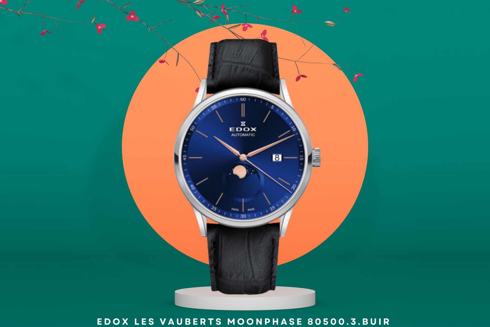 Đồng hồ Edox Les Vauberts Moonphase 80500.3.BUIR là chiếc đồng hồ kết hợp thiết kế cổ điển với chức năng phức tạp. Đây là chiếc đồng hồ hấp dẫn những người đánh giá cao sự kết hợp giữa sự thanh lịch và chức năng. Một trong những tính năng nổi bật của chiếc đồng hồ này là chỉ báo pha mặt trăng hay tính năng moonphase, thêm nét lãng mạn và tinh tế. Chức năng này theo dõi chính xác chu kỳ mặt trăng, khiến nó trở thành chi tiết hấp dẫn đối với những người đam mê đồng hồ.