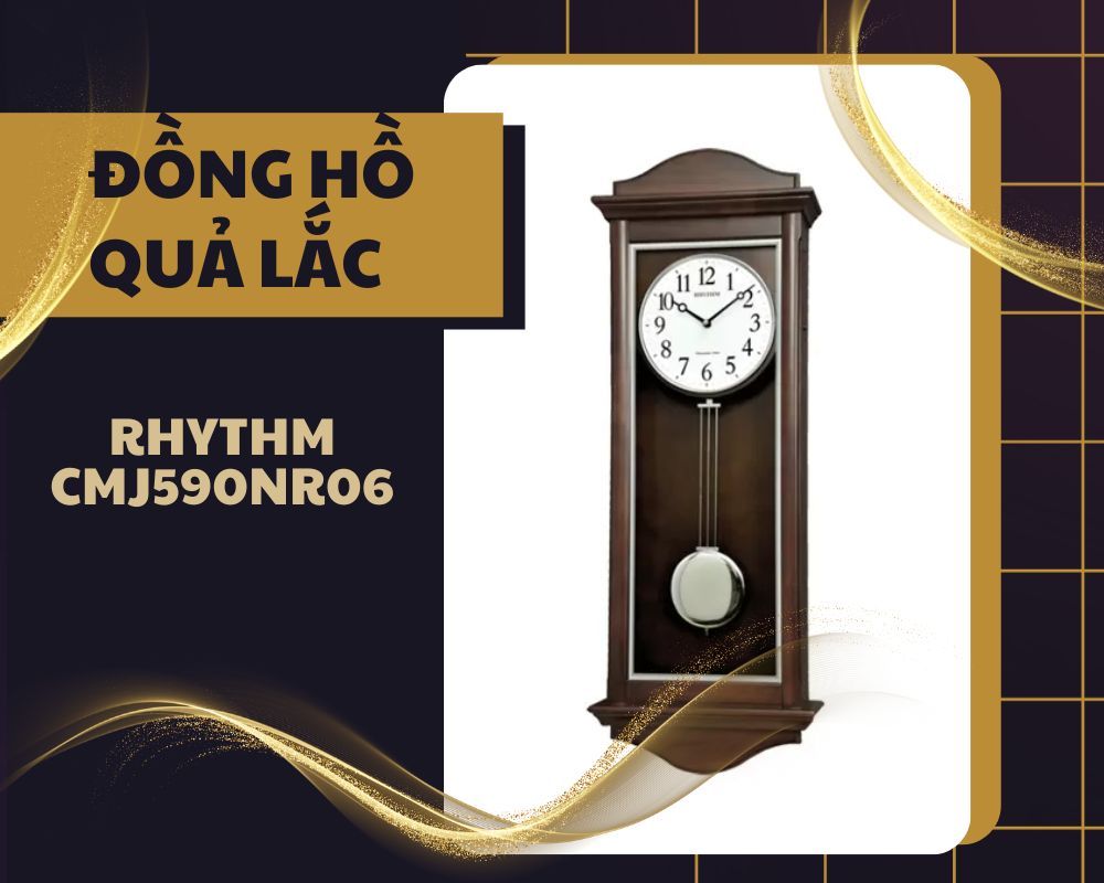 Duy Anh Watch gợi ý cho bạn mẫu Rhythm CMJ590NR06 là đồng hồ treo tường quả lắc bằng gỗ có thiết kế cổ điển. Nó có vỏ bằng gỗ sáng màu, mặt số màu trắng với các chữ số Ả Rập bằng vàng và kim giờ, phút và giây và quả lắc ở phía dưới