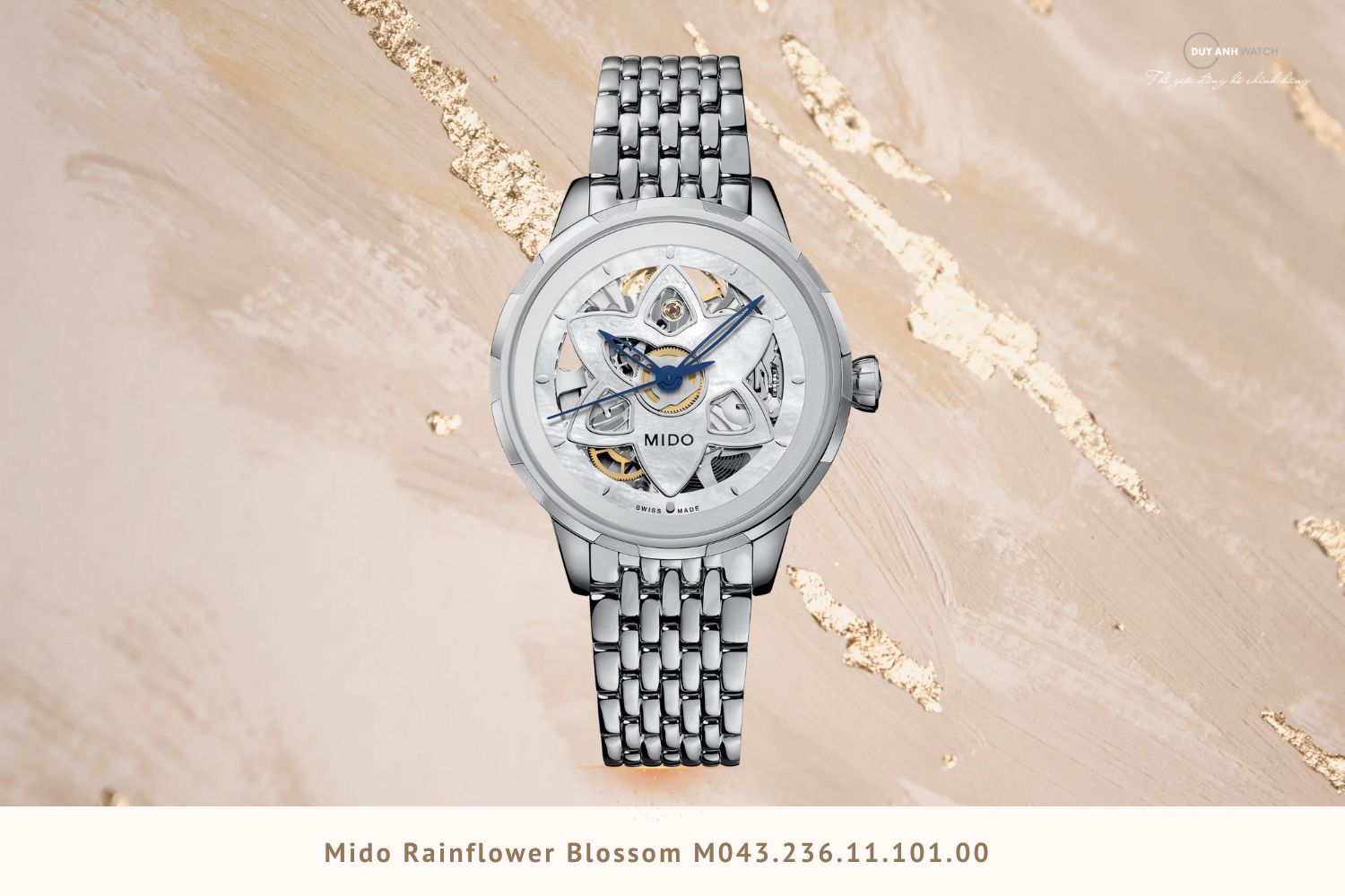 Mido Rainflower Blossom M043.236.11.101.00 là chiếc đồng hồ nữ quyến rũ và nữ tính lấy cảm hứng từ thiên nhiên, đặc biệt là hoa. Nó được thiết kế để trở thành một chiếc đồng hồ thời trang và thanh lịch. Kim hình cánh hoa và họa tiết hoa tinh tế trên mặt đồng hồ mang đến cho nó vẻ ngoài đặc biệt và nữ tính.