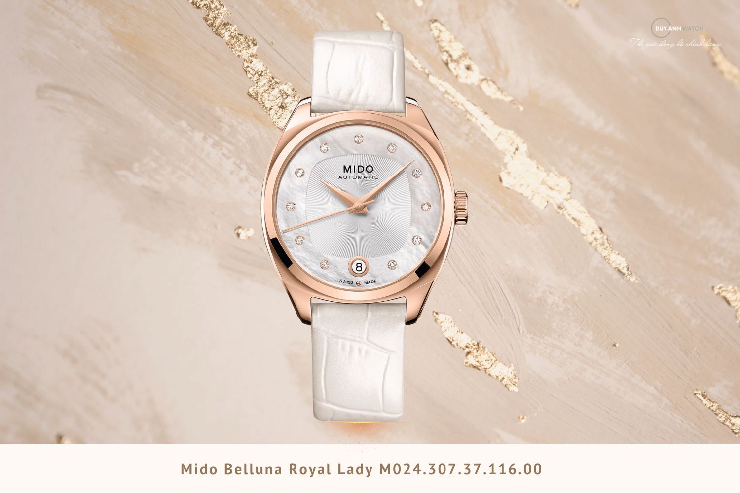 Mido Belluna Royal Lady M024.307.37.116.00 là chiếc đồng hồ nữ tinh tế và thanh lịch kết hợp thiết kế cổ điển với nét hiện đại. Đây là một phần của bộ sưu tập Belluna của Mido, thường lấy cảm hứng từ các địa danh kiến trúc, và mẫu đồng hồ này phản ánh điều đó với tính thẩm mỹ tinh tế của nó.